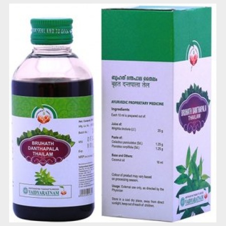 Vaidyaratnam Bruhath Danthapala Thailam:Effective in various types of skin disorder especially psoriasis and other exfoliating conditions.Saindhavadi Taila (Brihat)is an Ayurvedic medicine. It is an herbal oil. It is used in the treatment of rheumatoid arthritis, low back ache, injury to joints etc . This oil is prepared with Castor oil base.