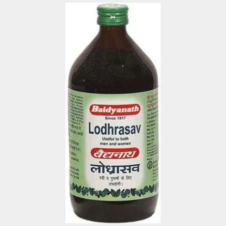 Baidyanath Lodhrasava is a combination of Lodhra, Kanchur, Pushkarmool, Ela, Murava, Vidaga, Triphala, Ajwain, Chavya, Chitrak, Indraya, Kutki, Bhaarangi, Kutpatha, Tagar, Atis, Nagkesher, Indrajava, MArich, Tejpatra, Motha, Kutaj, Dhtaki, and Jaggery.