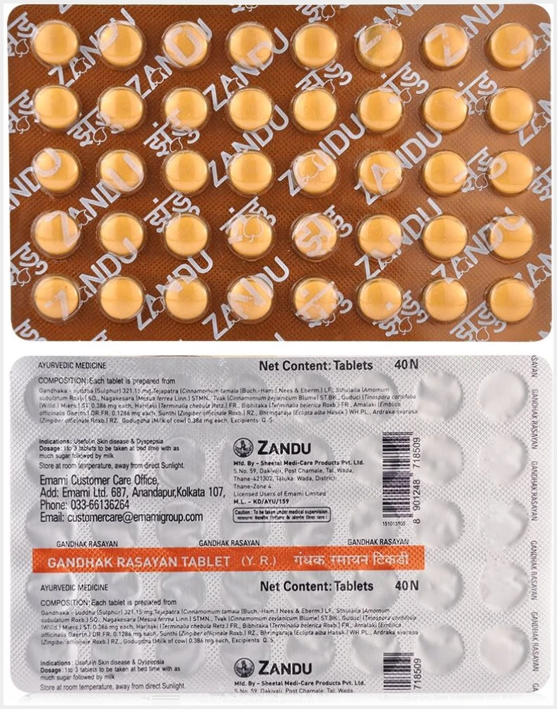 Gandhak Rasayan Tablets contain Suddha Gandhak, Chaturjat decoction, Tinospora Cordifolia, Amla, Haritaki, Vibhitaki, Zingiber Officinale, and Bhringraj juice. Suddha Gandhak is an antiviral component that offers antibacterial effects to treat various skin disorders.