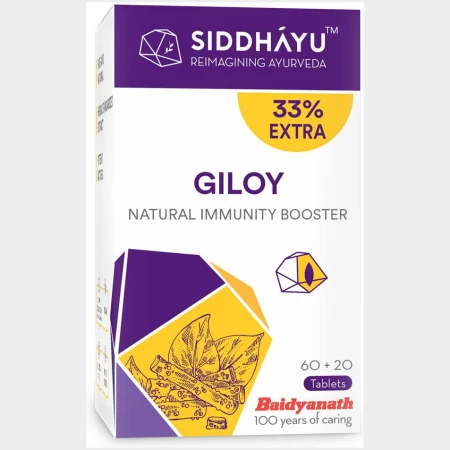 Siddhayu Giloy Tablet is a completely pure and natural extract of Giloy or Guduchi with super-effective, immunity-boosting, and antioxidant action. It helps strengthen the immune system and curbs respiratory infections. It also supports healthy liver and digestive function, which is affected due to a stressed immune function.